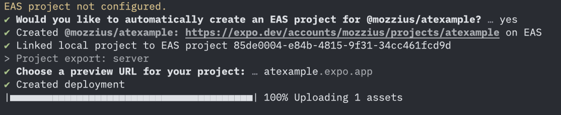 : (null as ExpoOAuthClient);You can now export the server bundle using bunx expo export --platform web --no-ssg, then deploy it using eas deploy. It will ask you to configure a preview URL - choose a name, and remember it, because we’ll use it for our metadata. In this guide, I’m going to use atexample.expo.app - replace this with whatever you picked.