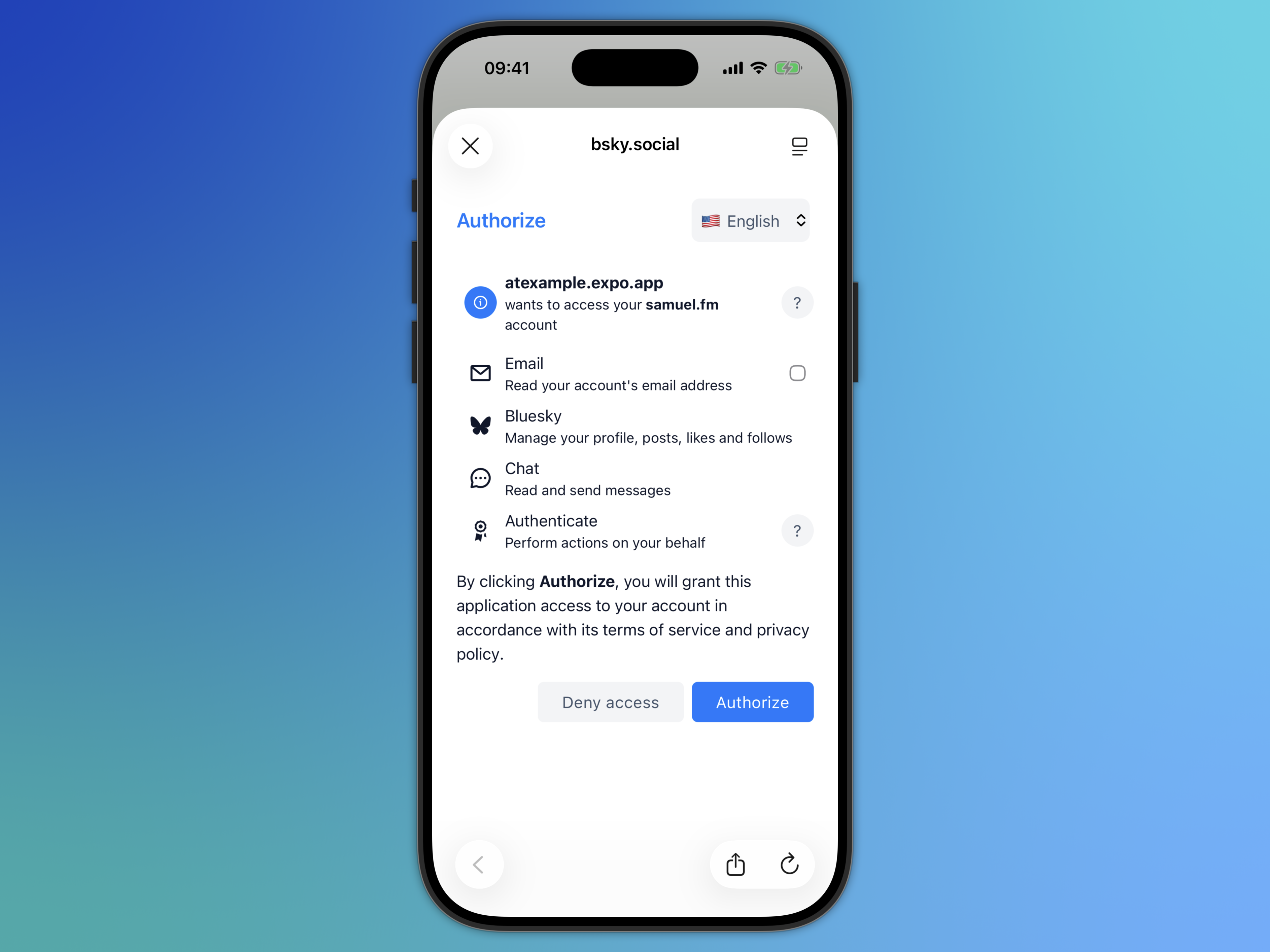 bunx eas deploy --prodOnce deployed, we can try logging in. If you have an Atmosphere/Bluesky account, you can use that - otherwise, you can make an account on the bsky.social PDS. It will automatically detect where your data is hosted and take you straight there. If you self-host a PDS, it will authenticate directly with your PDS.